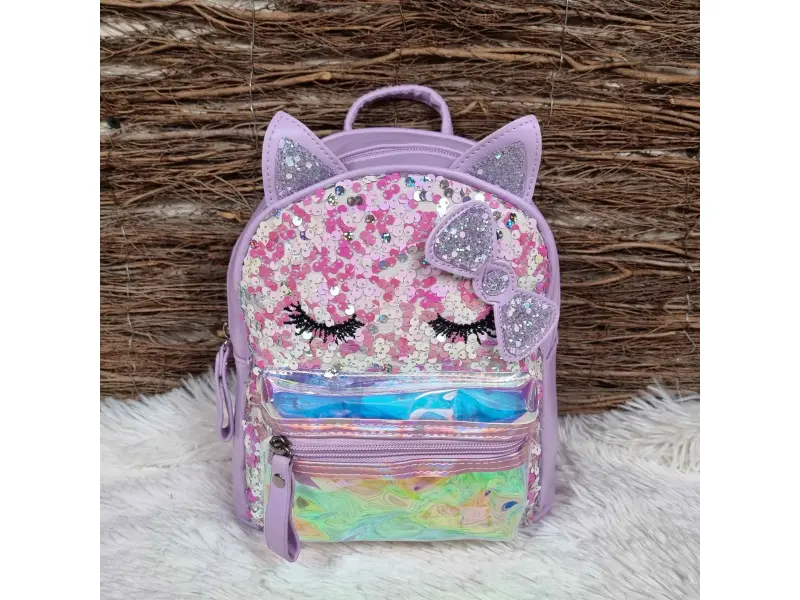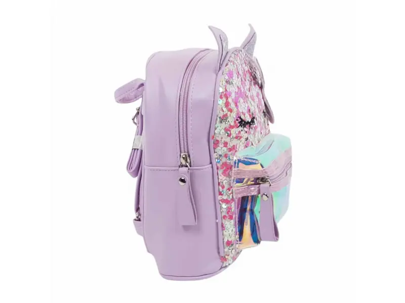 Качествена детска раница в лилав цвят с пайети. Детска раница с едно голямо отделение затварящо се с цип, малко вътрешно джобче и преден джоб с цип. Раница с регулиращи се презрамки и дръжка за носене.