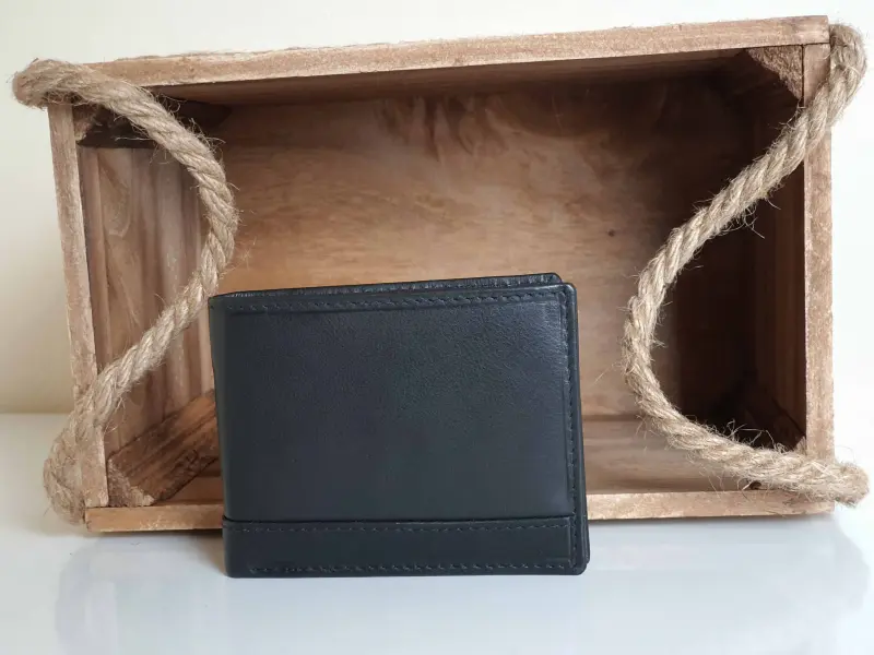 Мъжки портфейл от естествена кожа в черен цвят. Компактен размер с отделения за монети и пари , място за карти , документи и визитки. Качествена натурална кожа внос от Индия.