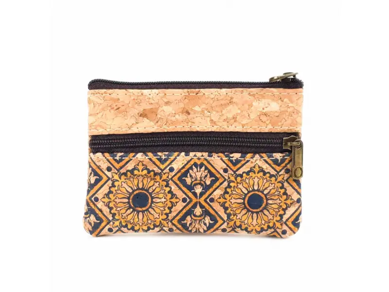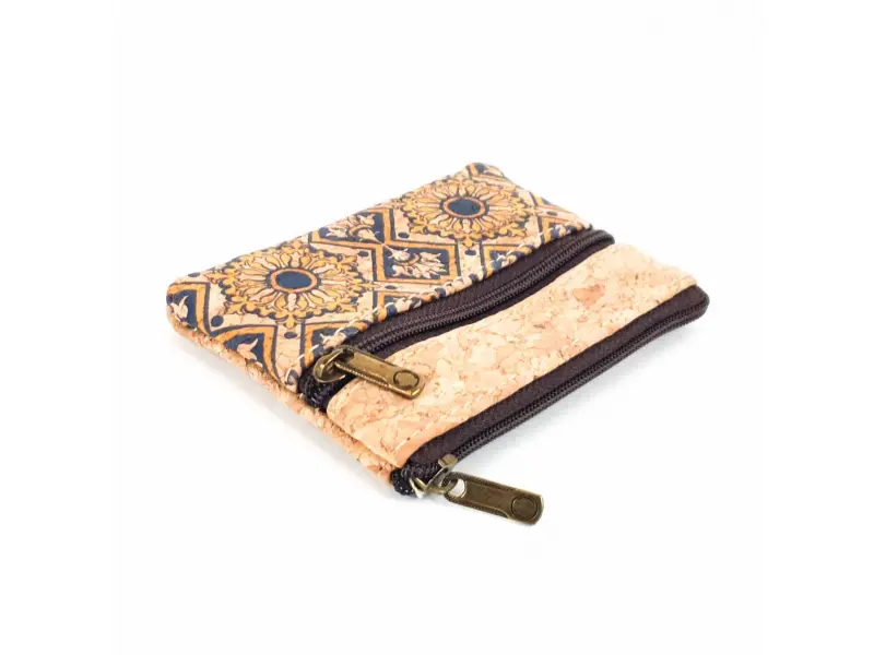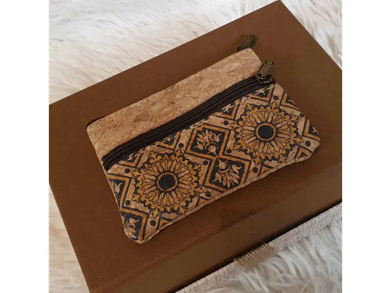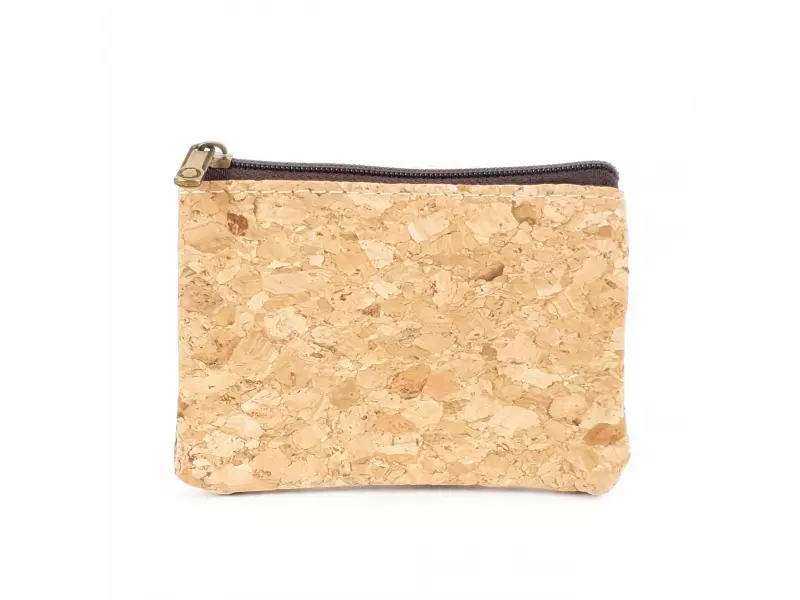 Малко портмоне тип монетник от корк. Монетник от екологична материя с две отделения затварящи се с цип с място за банкноти и монети.