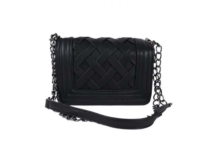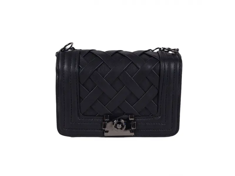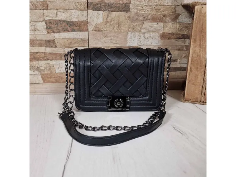 Стилна дамска чанта в черен цвят - Малка дамска чанта от еко кожа. - Едно основно отделение затварящо се с механизъм. - Малко вътрешно джобче с цип. - Дълга дръжка тип верижка в съчетание с еко кожа.