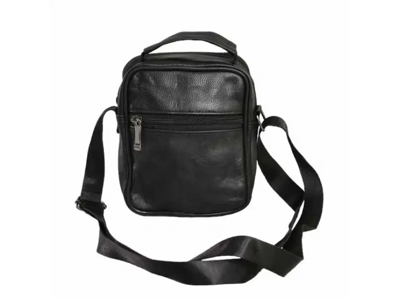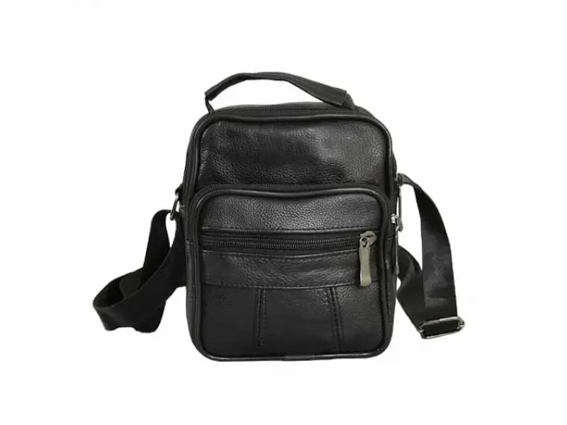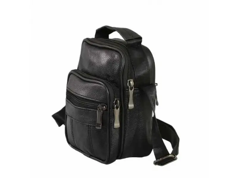 Малка мъжка чанта от кожа - Едно основно отделение с цип. - Два предни джоба с цип. - Заден джоб с цип. - Регулираща се презрамка. - Дръжка за носене в ръка.