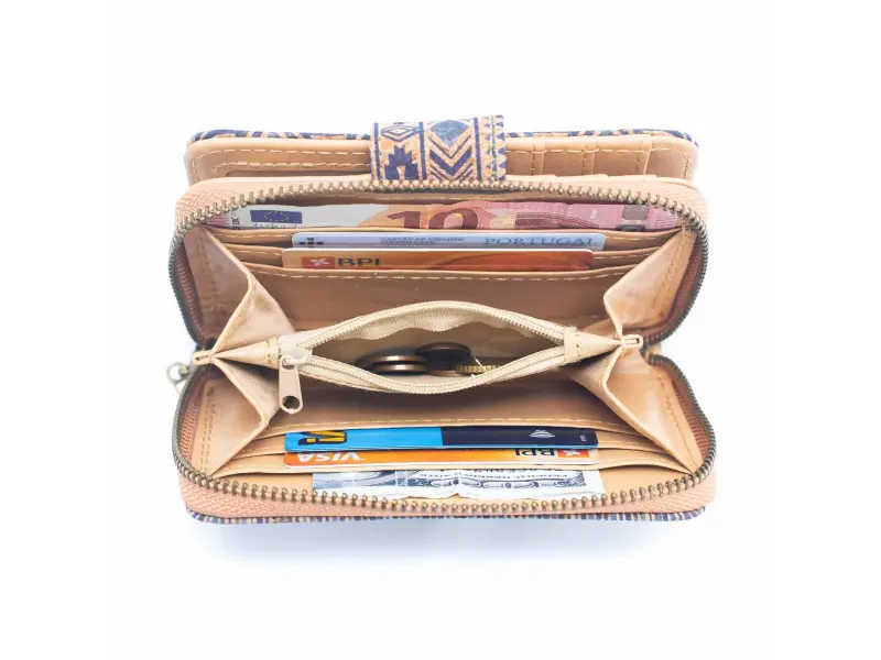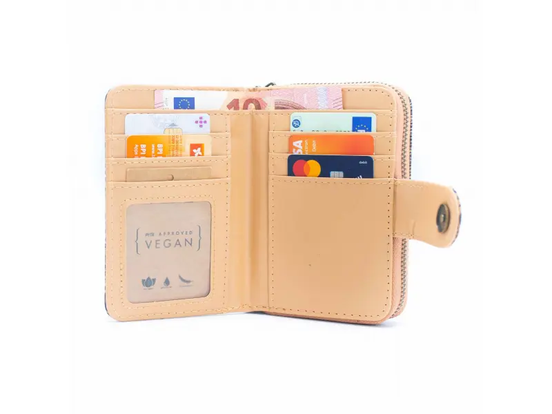 Малко корково портмоне с шарки Интересно дамско портмоне от екологична материя - корк. Качествено дамско портмоне със закопчалка, слотове за карти и документи, отделения за банкноти и монетник с цип.