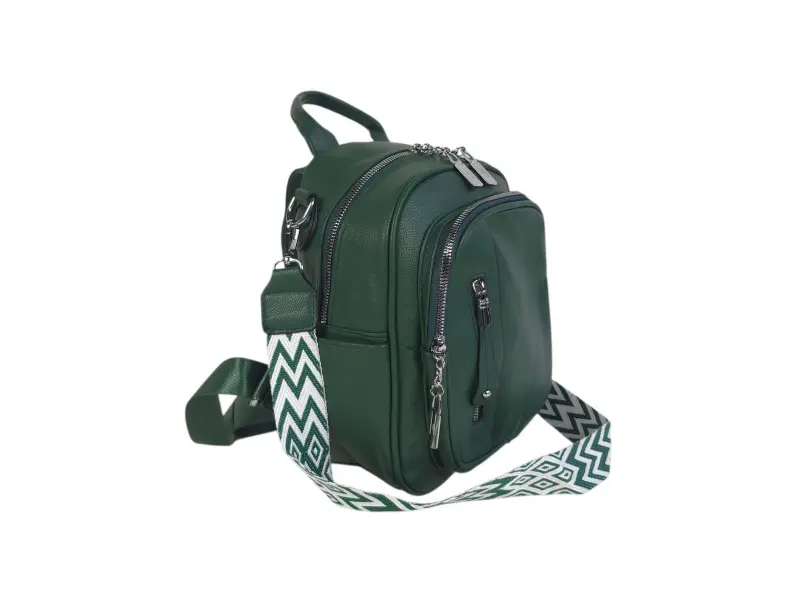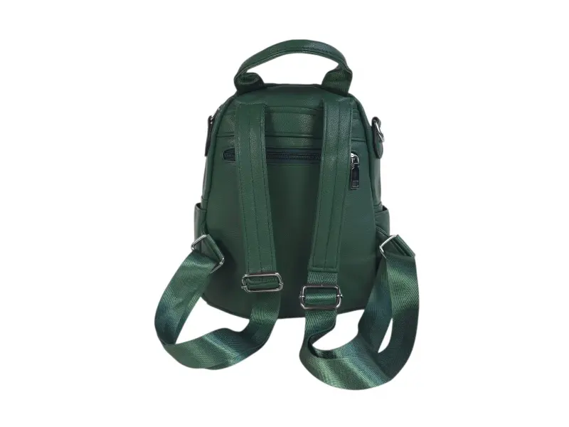 Компактна дамска раница - Дамска раница от еко кожа. - Едно голямо отделение с цип. - Вътрешен джоб с цип. - Вътрешен джоб без цип. - Два предни джоба с цип. - Заден джоб с цип. - Дръжка за носене на рамо. - Дръжка за носене в ръка. - Регулиращи се презрамки.