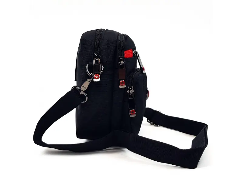 Малка мъжка чанта от високо качество материя. Много здрава чанта с качествени ципове и удобно разпределение на отделенията , има вариант за поставяне на колан. Мъжка чанта в черно - червен цвят.