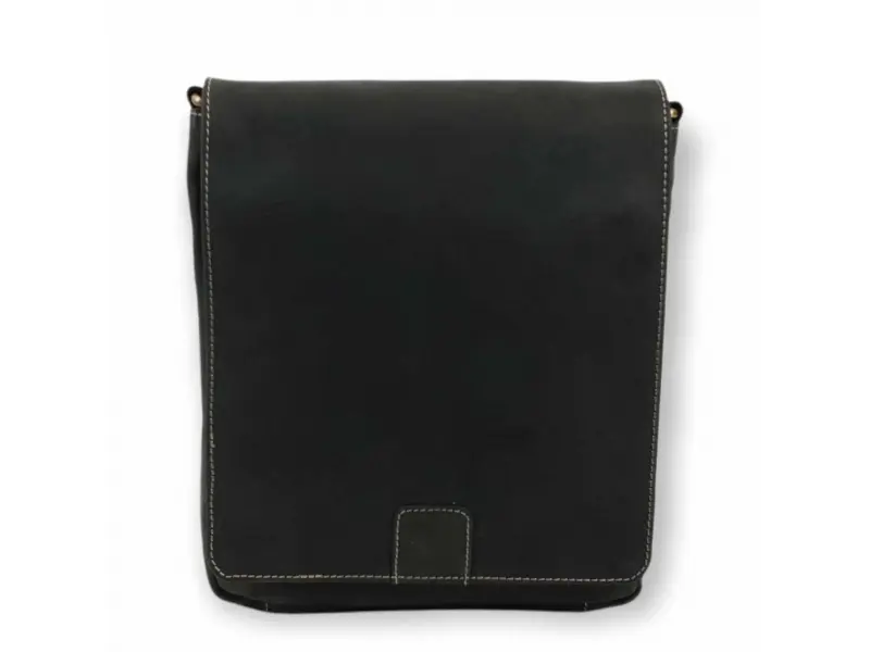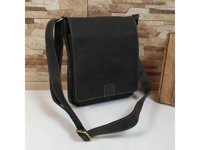 Качествена мъжка чанта от естествена телешка кожа със специална обработка - Hunter. Черна мъжка чанта с капак с магнитно закопчаване. Едно основно отделение без цип, вътрешно джобче с цип, място за телефон и ключове, преден джоб с цип и заден джоб с цип, регулираща се кожена дръжка.