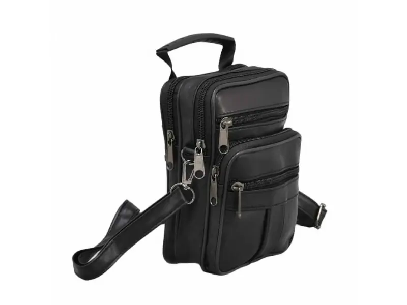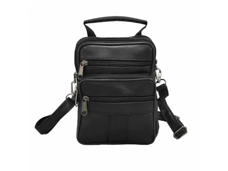 Компактна мъжка чанта от естествена кожа - Две основни отделения с цип. - Три предни джоба с цип. - Два задни джоба с цип. - Вътрешен джоб с цип. - Регулираща се презрамка. - Дръжка за носене в ръка.