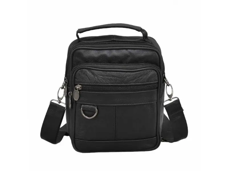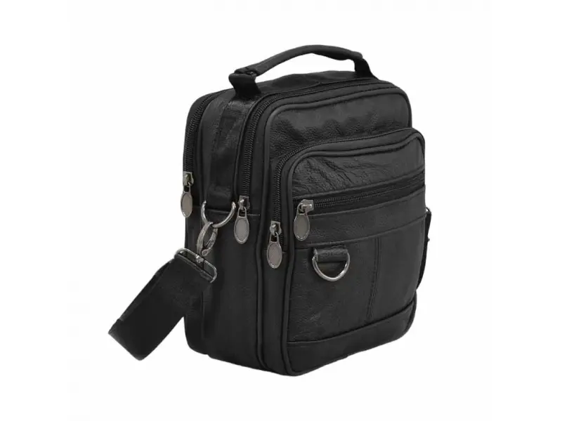 Кожена мъжка чанта в среден размер - Две основни отделения с цип. - Малък вътрешен джоб с цип. - Два предни джоба с цип. - Заден джоб с цип. - Регулираща се презрамка. - Дръжка за носене в ръка.