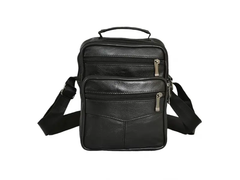 Мъжка чанта от естествена кожа на промоция - Едно основно отделение с цип. - Три предни джоба с цип. - Заден джоб с цип. - Регулираща се презрамка. - Дръжка за носене в ръка.