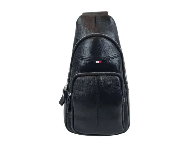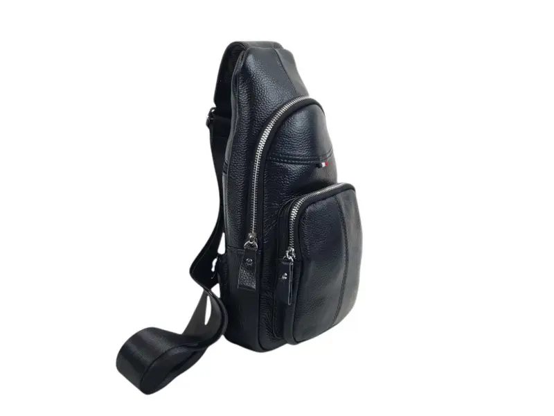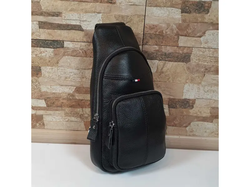 Мъжка чанта за през гърди от естествена кожа. Черна мъжка чанта, която може да се носи през гърди, рамо или гръб тип раница. Мъжка чанта с едно основно отделение с цип, малко вътрешно джобче с цип, отделение за телефон или документи, преден и заден джоб с цип, удобна регулираща се презрамка.