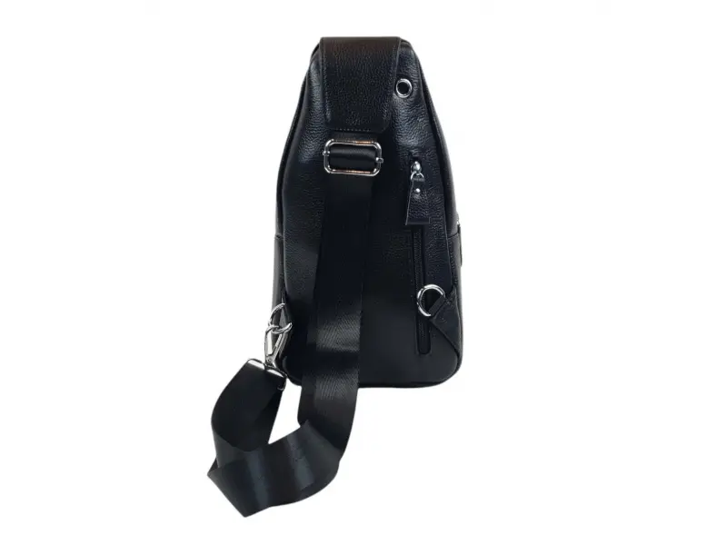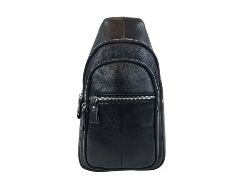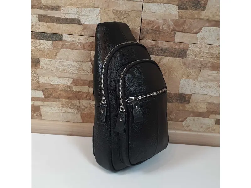 Мъжка чанта за през гърди от естествена кожа. Черна мъжка чанта, която може да се носи през гърди, рамо или гръб тип раница. Мъжка чанта с едно основно отделение с цип, малко вътрешно джобче с цип, отделение за телефон, два предни и един заден джоб с цип, удобна регулираща се презрамка.