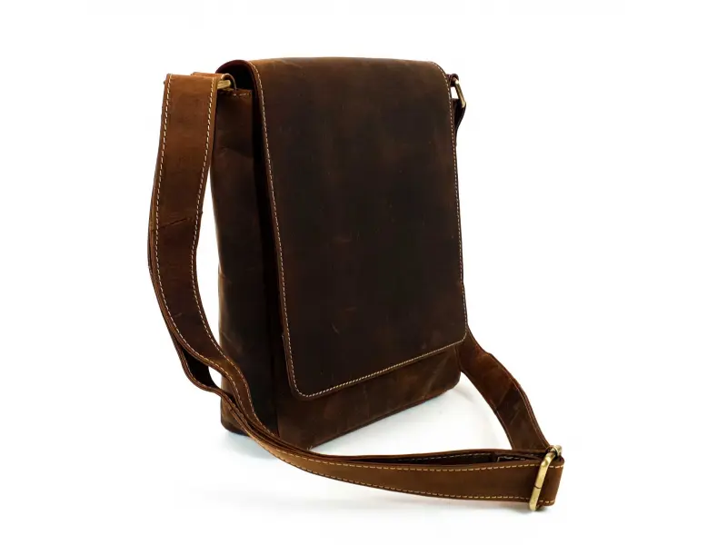 Качествена мъжка чанта от естествена телешка кожа със специална обработка - Hunter. Голяма кафява мъжка чанта с капак и магнитно закопчаване, едно основно отделение с цип, вътрешно малко джобче с цип, място за телефон, предно отделения и заден джоб с цип, регулираща се кожен дръжки.