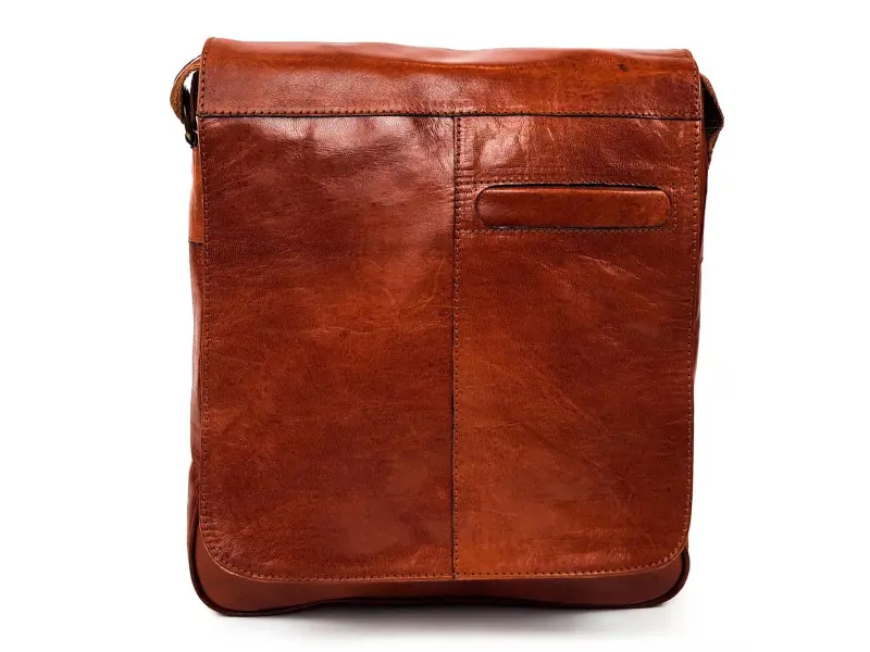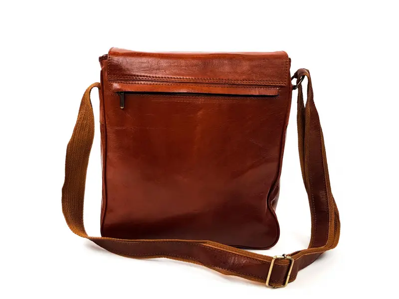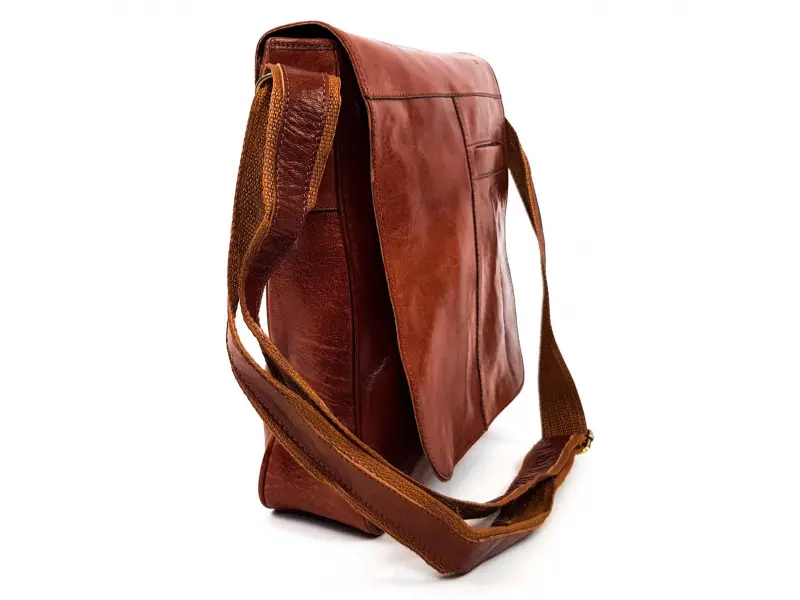 Качествена мъжка чанта от естествена кожа , внос от Мароко. 100 % кожа при която не са използвани допълнителни химикали , при обработката. Мъжка голяма чанта за през рамо в кафяв цвят. Мъжка кожена чанта затваряща се с капак с едно голямо отделение с цип , предно джобче и заден джоб с цип. Регулираща се презрамка.