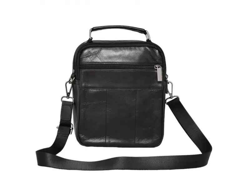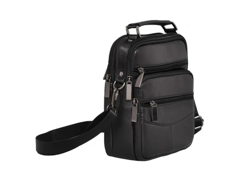 Мъжка чанта от естествена кожа - Две основни отделения с цип. - Малък вътрешен джоб с цип. - Три предни джоба с цип. - Заден джоб с цип. - Регулираща се презрамка. - Дръжка за носене в ръка.