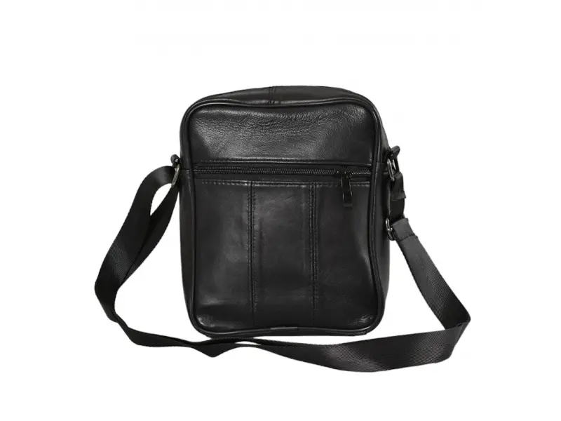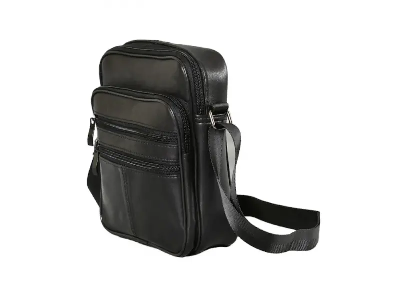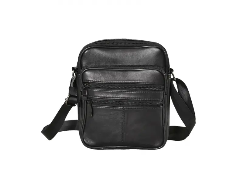 Компактна мъжка чанта от естествена кожа - Едно основно отделение с цип. - Малък вътрешен джоб с цип. - Три предни джоба с цип. - Заден джоб с цип. - Регулираща се презрамка. - Дръжка за носене в ръка.