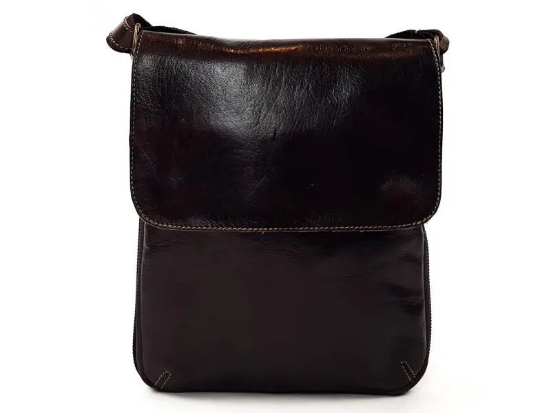 Качествена мъжка чанта от естествена кожа в тъмно кафяв цвят , тънък модел с капак и цип през цялата чанта който се отваря и увеличава обема на чантата. Мъжка кожена чанта с капак и регулираща се дълга дръжка.