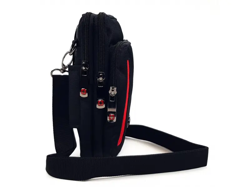 Мъжка чанта от много здрава материя в черен цвят с червено и кръст , малка чанта , тънка спортно - елегантен модел на дакар с здрави ципове и регулираща се презрамка и възможност за закачане на колан..