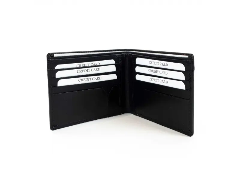Качествен мъжки портфейл от естествена кожа в черен цвят. Мъжки портфейл с подплата от естествена кожа с удобно разпределение за банкноти, карти и документи, без монетник.