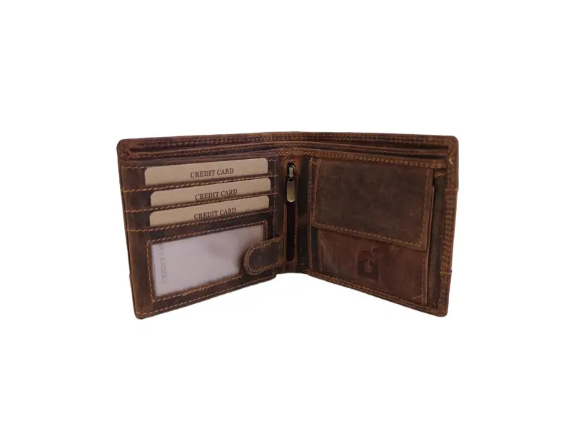 Качествен мъжки портфейл - Мъжки портфейл от естествена кожа. - Отделенение за банкноти с преграда. - Слотове за карти и лични документи. - Отделение за монети закопчаващо се с копче.