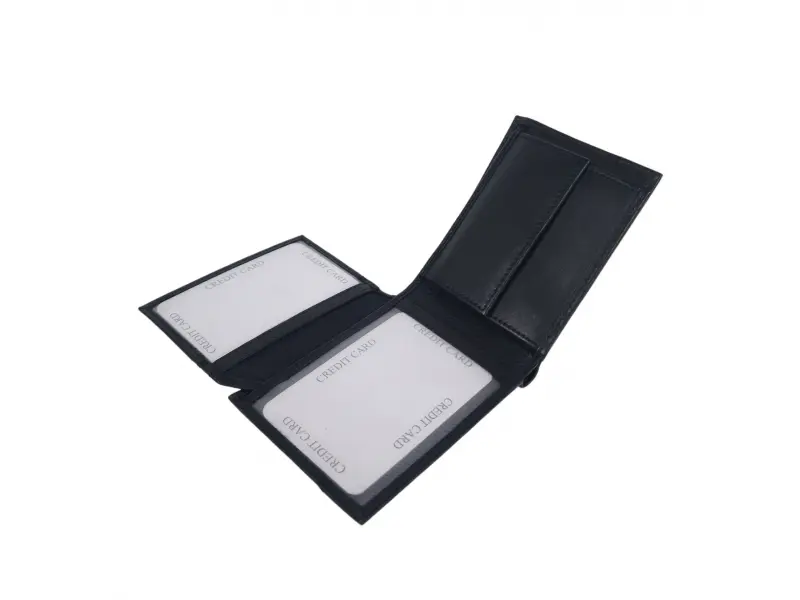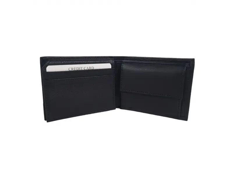 Има отделение за банкноти, слотове за карти и лични документи, както и отделение за монети с копче.