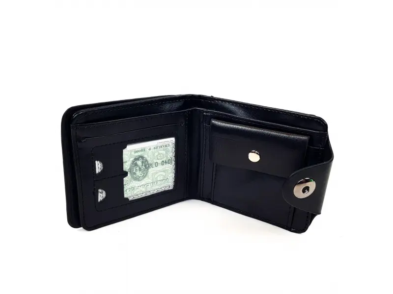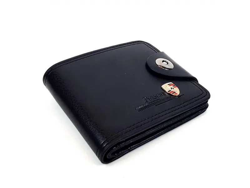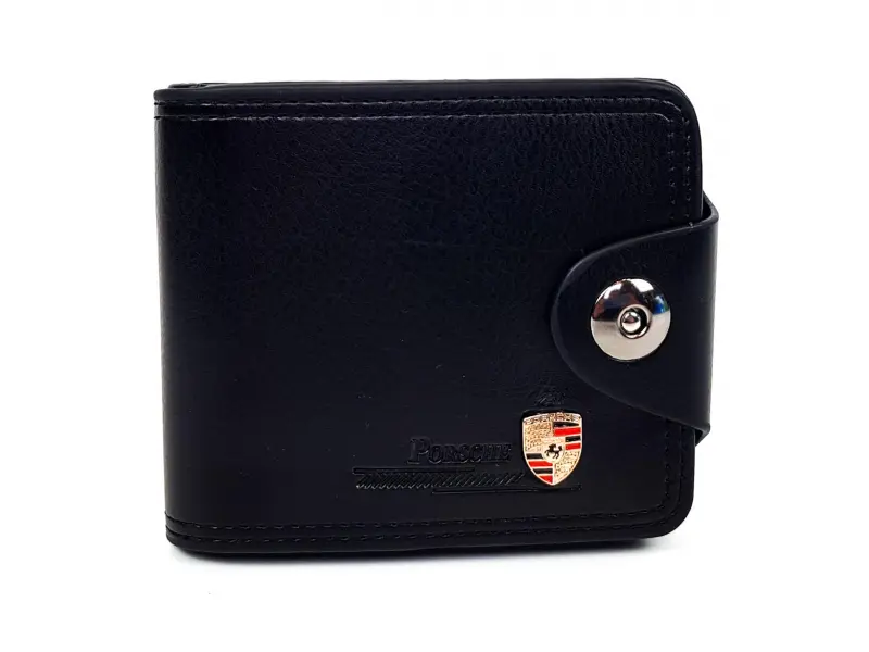 Мъжки черен портфейл от изкуствена кожа с логото на Порше. Портфейл със закопчалка , две прегради за банкноти , отделение за монети , слотове за карти , визитки и документи. Страхотен подарък за феновете на марката коли Порше.