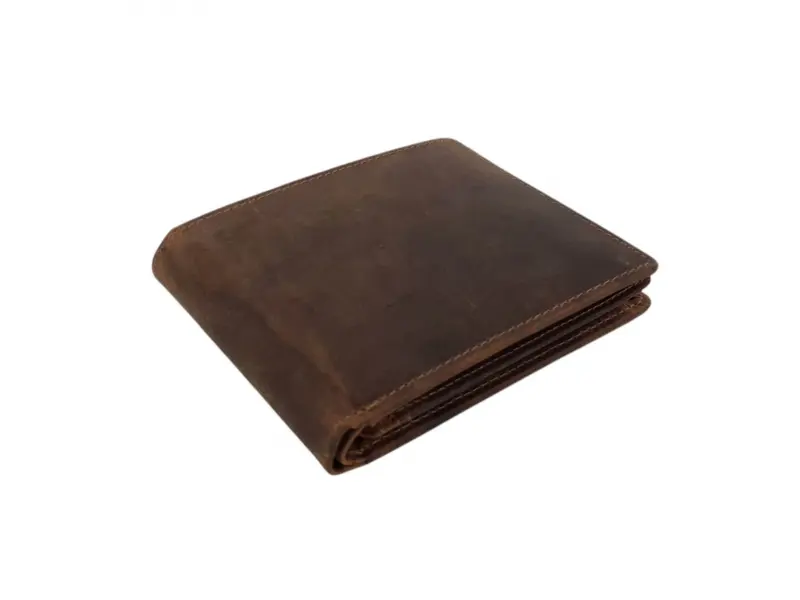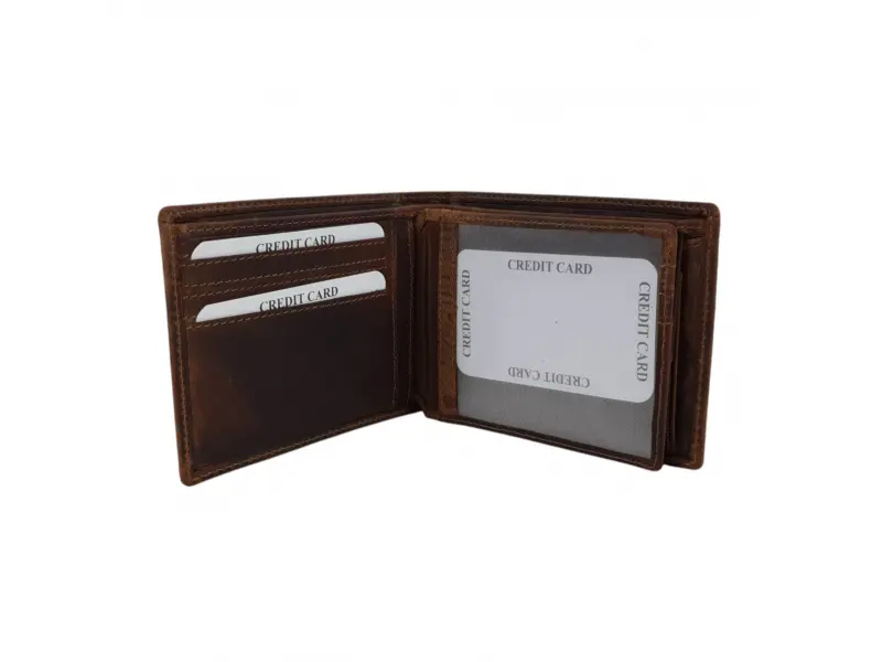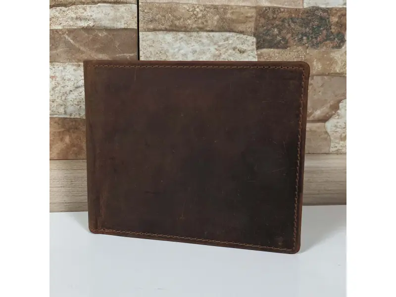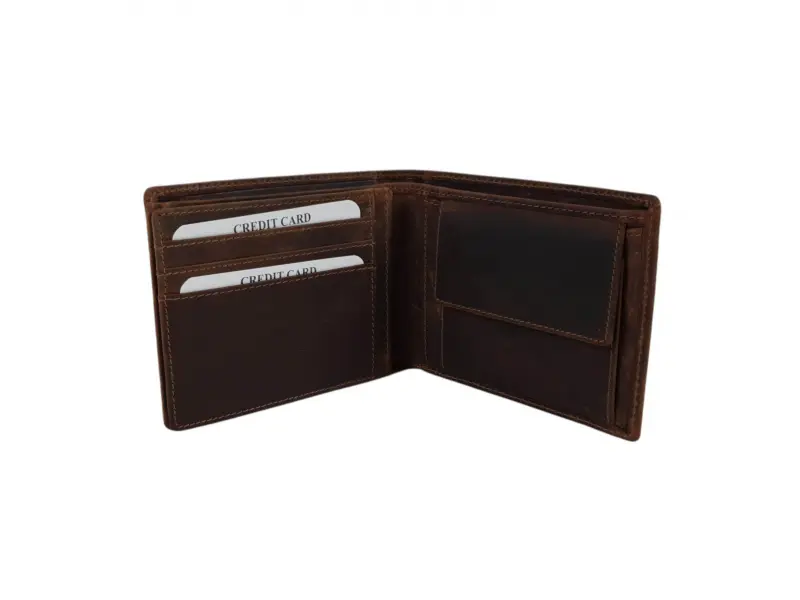 Удобен мъжки портфейл от специално обратотена hunter естествена кожа. Кафяв портфейл с вътрешно отделение за монети, слотове за карти и преграда за банкноти.