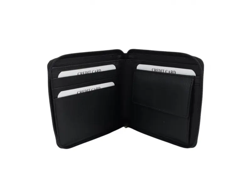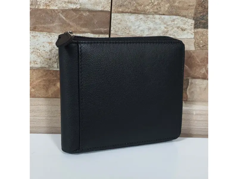 Удобен мъжки портфейл от телешка естествена кожа, затварящ се с цип. Черен портфейл с вътрешно отделение за монети, слотове за карти и преграда за банкноти.