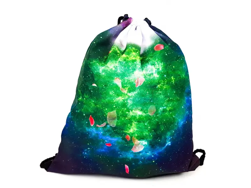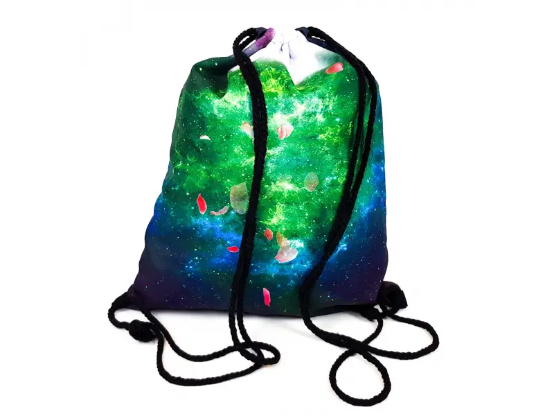 Интересна мешка с космически десен , звезди и листа от цвете. Раница тип мешка с едно отделение , пристягащо се с въжени презрамки.