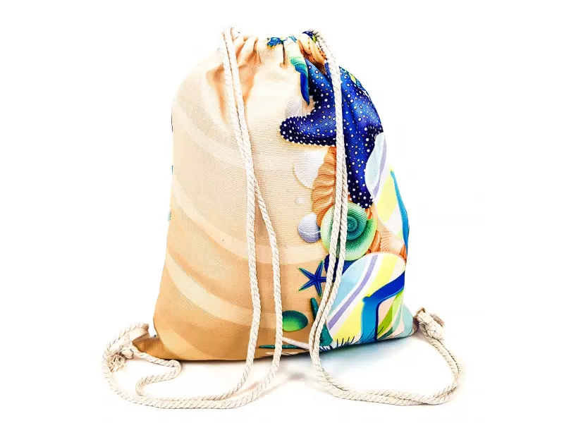 Мешка с десен на морското дъно - морски звезди , корали и пясък. Качествена мешка подходяща за плаж или за ежедневието с въжени дръжки , пристягащи голямото отделение.
