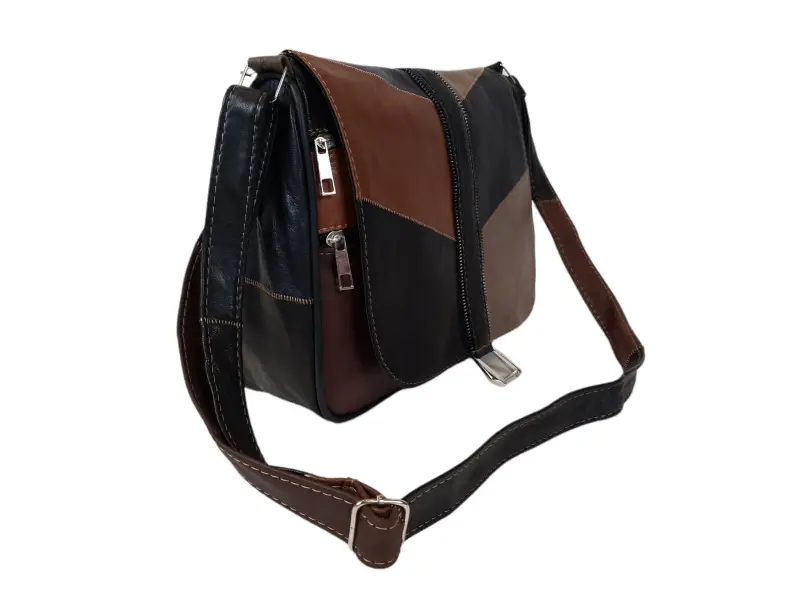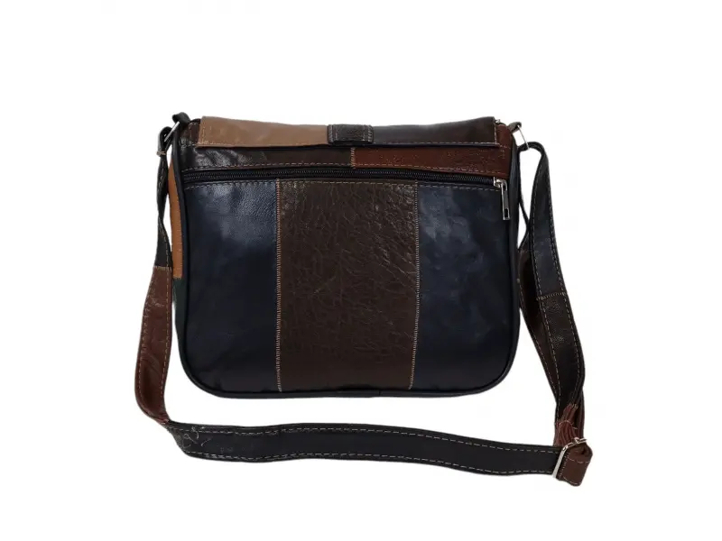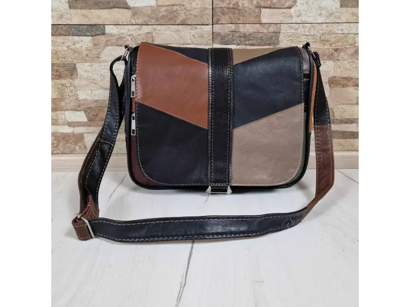 Качествена дамска чанта от агнешка естествена кожа. Многоцветна чанта с едно основно отделение с цип и магнитно закопчаване, вътрешно джобче с цип, два предни джоба под капака с цип и заден джоб с цип. Удобна чанта с дълга регулираща се дръжка.