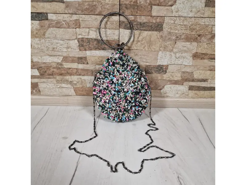 Многоцветна официална чанта - Официална дамска чанта с едно отделение. - Отваряне и затваряне с механизъм. - Метален кант. - Дръжка за носене в ръка. - Дълга дръжка тип верижка.