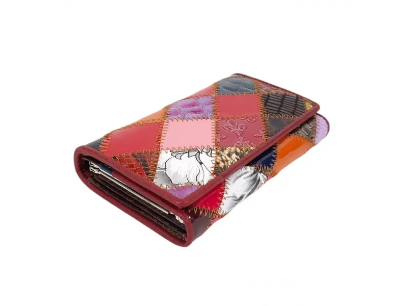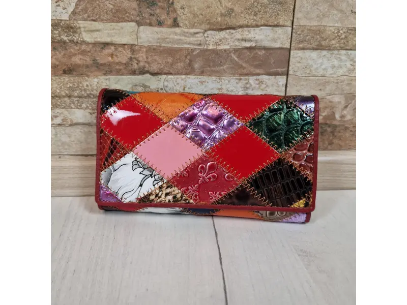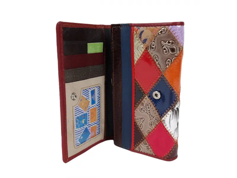 Малко портмоне от естествена кожа Качествено дамско портмоне от естествена кожа. Голямо многоцветно портмоне с прегради за банкноти, слотове за карти и лични документи, вътрешен монетник с щипка и задно джобче. Има различни варианти на разположението на цветовете.