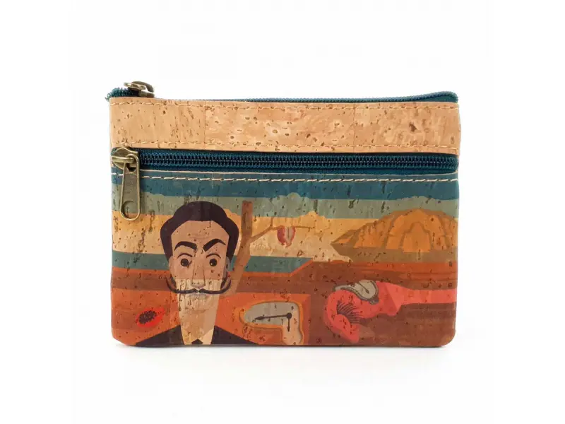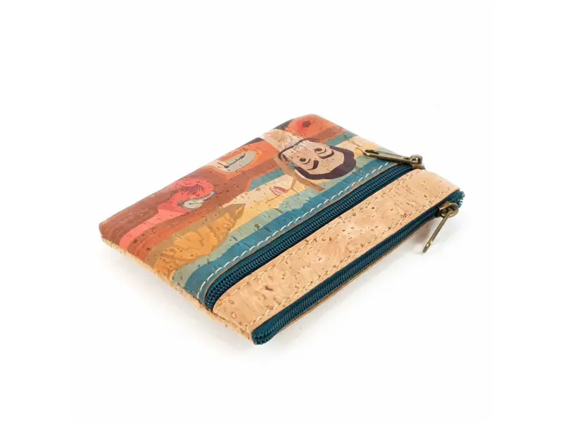 Монетник от корк - Густаво. Интересно дамско портмоне тип монетник от корк. Дизайнерски монетник от екологична материя с две отделения с цип и място за карти.