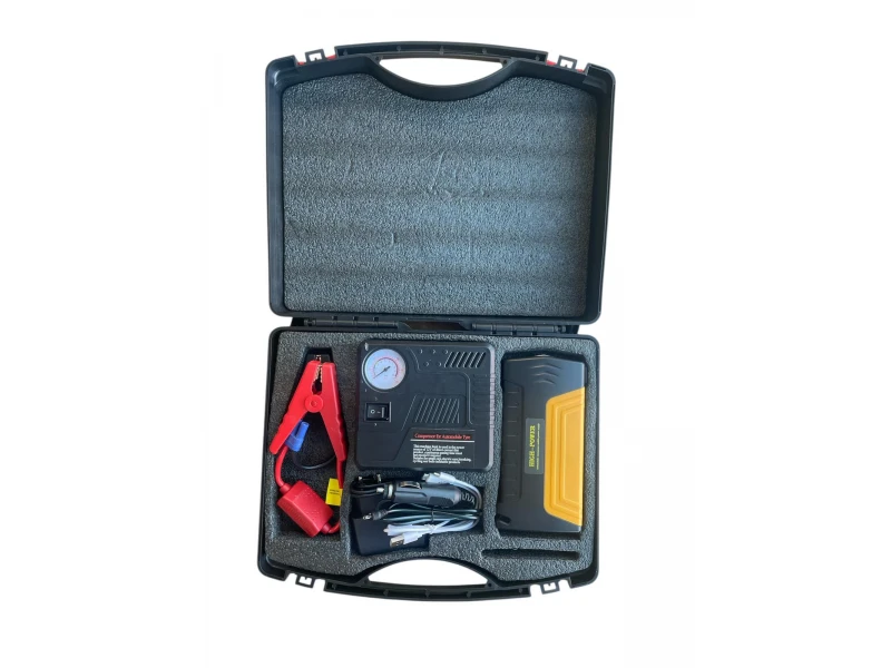 Мултифункционален комплект High Power Jump Starter – Стартерно устройство за кола с компресорТози комплект е идеален за аварийни ситуации, като стартиране на автомобил с изтощен акумулатор, напомпване на гуми и зареждане на мобилни устройства. Подходящ е за къмпинг, пътувания и офроуд приключения.Основни функции и предимства:✅ Джъмп стартер + автомобилен компресор 12V – идеален за аварийни ситуации ✅ Вграден мощен фенер + сигнални LED светлини (синьо-червено) ✅ Функция Power Bank – зарежда смартфони, лаптопи и таблети ✅ Режими на работа: 5V, 9V, 12V, 19V ✅ Презареждаща се акумулаторна батерия – над 3000 цикъла живот ✅ Компактна транспортна кутия за удобно съхранение и пренасянеСъдържание на комплекта:Стартерно устройствоАвтомобилен компресор 12VСвързващ кабел с изолирани клемиАдаптер 220V + зарядно за автомобил (12-24V)USB накрайници за смартфони, лаптопи и други устройстваИглички за помпене на топки и надуваеми аксесоариВградено ножче за забелване на кабелиТехнически характеристики:Стартов ток: 300A / Пиков ток: 600AМаксимален ток на зареждане: 1500AИзходно напрежение: 5V, 9V, 12V, 19VЗахранващо напрежение: 12VТегло: 2.5 кгЦвят: ЧеренПерфектен за автомобилни аварии, пътувания, къмпинг и работа в екстремни условия!