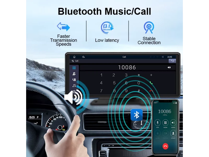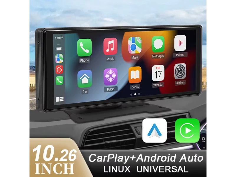 CarPlay H105V 10.26″ мултимедия с IPS дисплей, безжичен Apple CarPlay и Android Auto, MP5 плейър, Bluetooth, AUX, 5 V/3 A захранване и лесен монтаж без разглобяване на таблото.