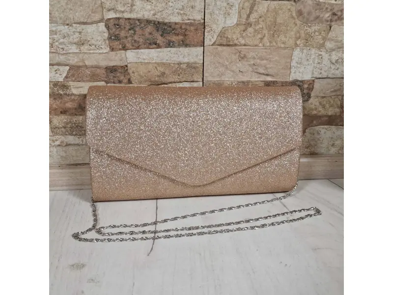 Вечерна чанта в красив розово златен цвят - Официална дамска чанта с едно отделение. - Отваряне и затваряне с копче тип магнит. - Дълга дръжка тип верижка в сребърен цвят.