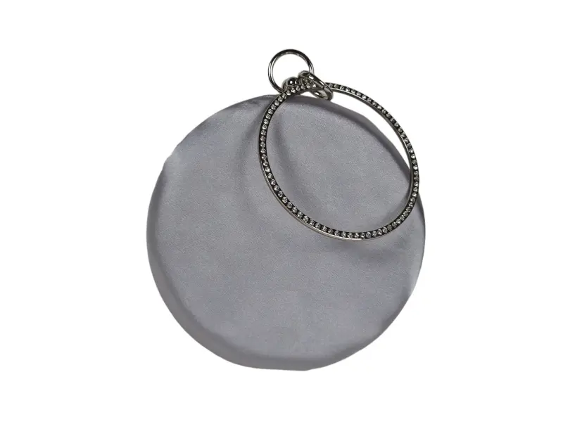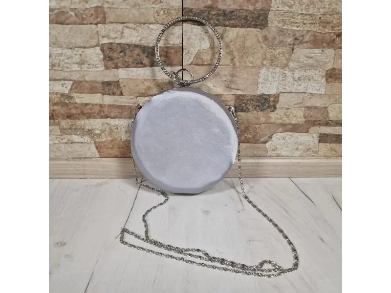 Кръгла дамска чанта - Официална дамска чанта с едно отделение. - Отваряне и затваряне с механизъм. - Метален кант. - Дръжка за носене в ръка. - Дълга дръжка тип верижка.