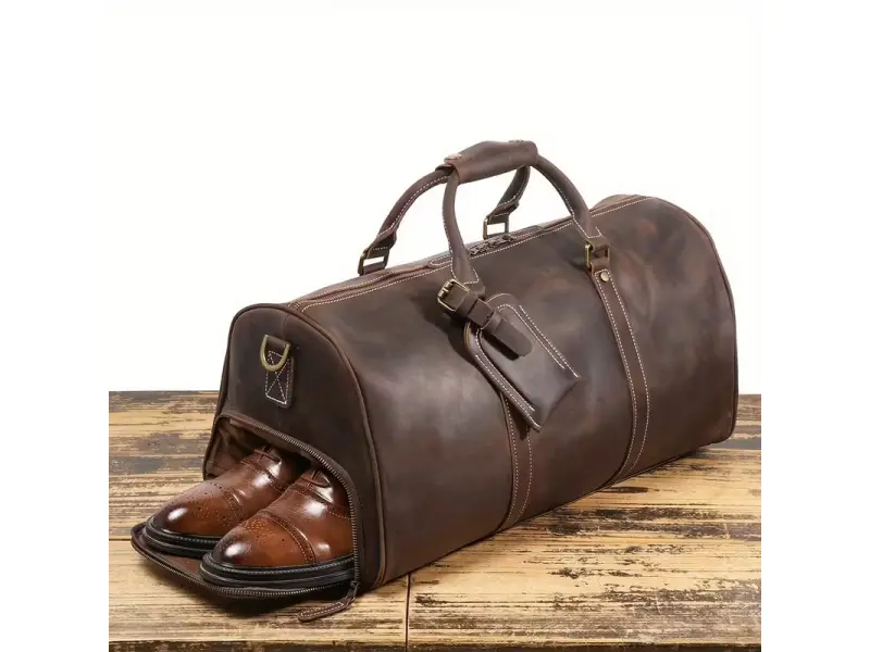 Качествен чанта за път с удобни отделения - Сак от специално обработена кара, ествествена кожа. - Едно основно отделение с цип. - Вътрешенни малки прегради - Странично отделение за обувки с цип. - Удобни дръжки за носене. - Дълга регулираща се дръжка.