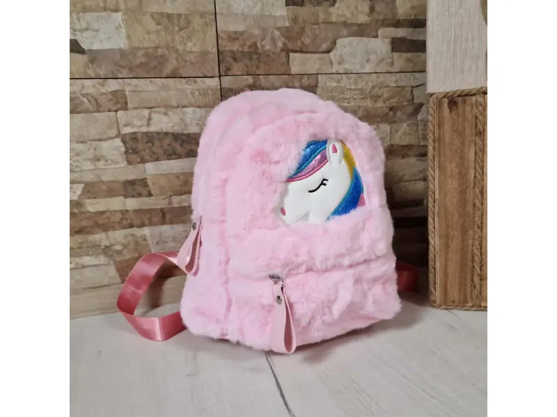 Нова плюшена раница с еднорог - Детска плюшена раница. - Едно основно отделение с цип. - Преден джоб с цип. - Регулиращи се презрамки. - Дръжка за носене в ръка.