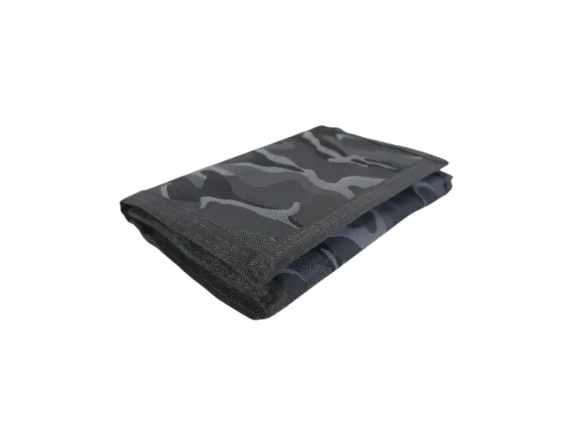 Камуфлажен черен портфейл - Мъжки портфейл от плат. - Отделенение за банкноти. - Отделение с цип. - Слотове за карти и лични документи. - Монетник с цип. - Връзка за носене.