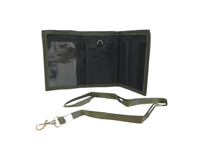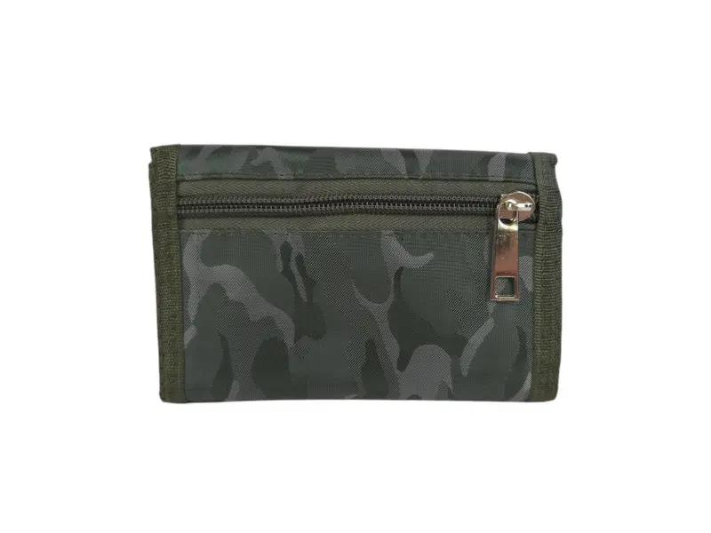 Камуфлажен зелен портфейл - Мъжки портфейл от плат. - Отделенение за банкноти. - Отделение с цип. - Слотове за карти и лични документи. - Монетник с цип. - Връзка за носене.