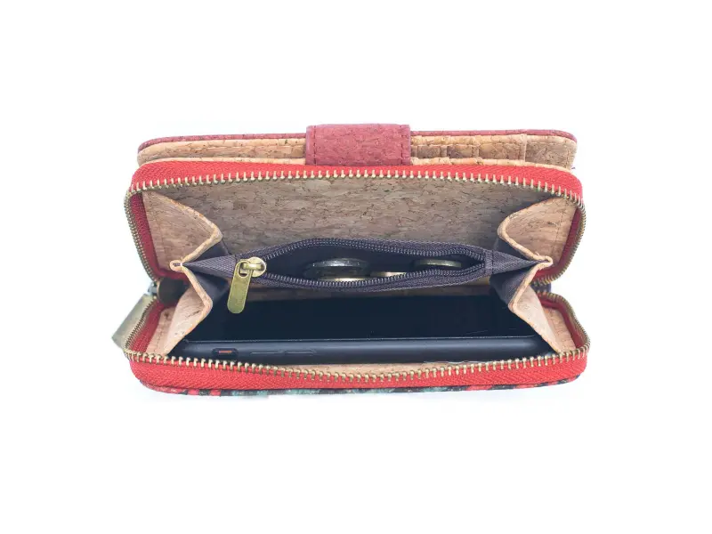 Качествено дамско портмоне от екологична материя - корк. Удобно дамско портмоне със закопчалка и външен монетник затварящ се с цип, преграда за монети и малък монетник с цип, много слотове за карти и документи и отделение за банкноти.