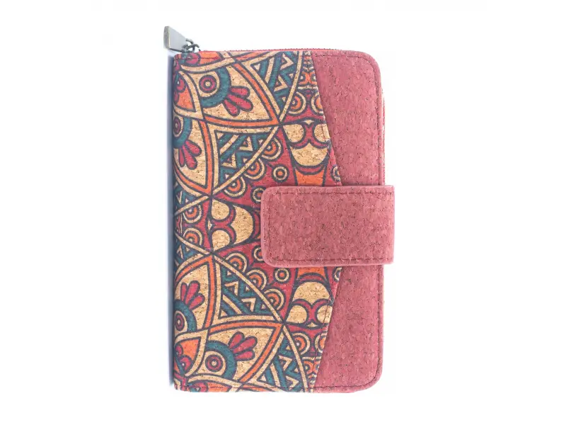 Корково портмоне с интересен дизайн Качествено дамско портмоне от екологична материя - корк. Удобно дамско портмоне със закопчалка и външен монетник затварящ се с цип, преграда за монети и малък монетник с цип, много слотове за карти и документи и отделение за банкноти.