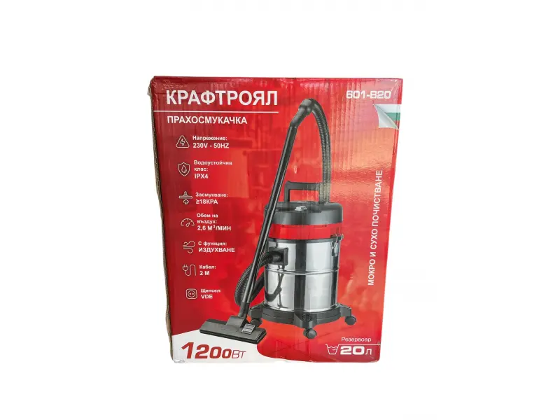 Прахосмукачка KraftRoyal 601-B30 – Мощност и Многофункционалност 💪🧹 Идеална за Всеки Дом 🏠 Прахосмукачката KraftRoyal 601-B30 е проектирана да отговори на всички ваши нужди за почистване. С мощност от 1200 W и високо ниво на засмукване ≥18 KPA, тя е идеална за сухо и мокро почистване в дома, гаража или градината. Практичност и Удобство 🧼 С 30-литров резервоар от неръждаема стомана, KraftRoyal 601-B30 осигурява дълготрайна работа без често изпразване. Тя е способна да премахва както едри строителни отпадъци, така и вода, което я прави изключително многофункционална. Лесно Почистване без Торба Висококачественият платнен филтър позволява работа без торба, а удълженият маркуч и комплектът дюзи осигуряват достъп до труднодостъпни места. С четирите въртящи се колела, маневреността е лесна и удобна. Характеристики на Продукта 📋 Характеристика Стойност Напрежение 230V / 50Hz Мощност 1200W Водоустойчив клас IPX4 Засмукване ≥18 KPA Обем на въздуха 2.6 м³/мин Резервоар 30 литра (неръждаема стомана) Филтър текстилен (мембранен), за работа без торба Дължина на кабела 2 м С функция за издухване Да Комплект дюзи и маркуч Да Колела 4 въртящи се за лесно движение Подходяща за сухо и мокро почистване Често задавани въпроси ❓ Каква е мощността на прахосмукачката? Прахосмукачката KraftRoyal 601-B30 разполага с мощност от 1200 W, което я прави изключително ефективна. Може ли да се използва за мокро почистване? Да, тя е проектирана за сухо и мокро почистване, което я прави многофункционална.