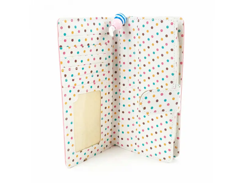 Портмонето е в прасковен цвят с цветни точки.