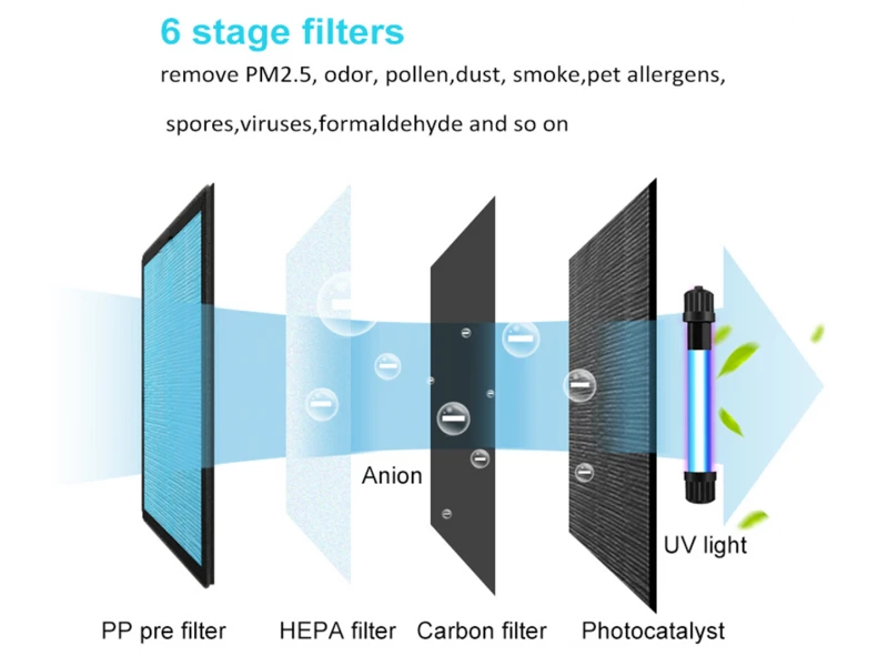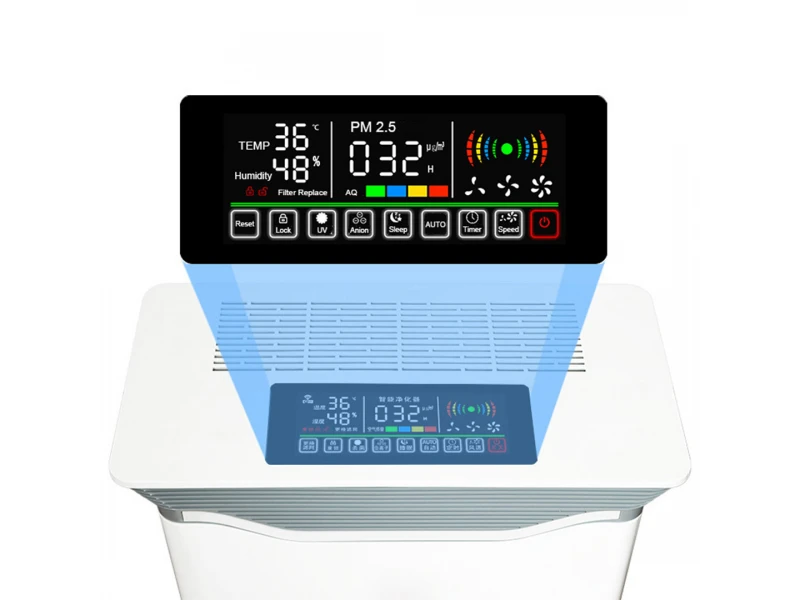 Спецификация:Входно напрежение220V, честота: 50 HZИзходна мощност75WМощност на UV лампата25WДължина на UV тръбатаH тръба 317ММИнтензитет на ултравиолетовата лампа≥50um / cm2Максималната дължина на вълната на ултравиолетовото лъчение      253.7nmАтмосферно налягане86Kpa -106JKraСензор Weisheng от първо поколение (.WS1.)Температура и влажност на работната среда-15 ~ 50°С, влажност: <85%Консумация на енергия в режим на готовност≤0,5W при 220V / 50HZВентилатор220V AC мотор с регулиране на скоростта, мощност ≤130WСензор за частициОткрива PM2.5 с широчинно импулсна модулацияРазмер на продукта360 * 200 * 63OммСветлинната лента автоматично променяща цвета си спрямо качеството на въздуха.Сензорен контролен екран, инфрачервено дистанционно управление.Захранване на четирицветна светлинна лента 12V (12V цветен светлинен светодиод).