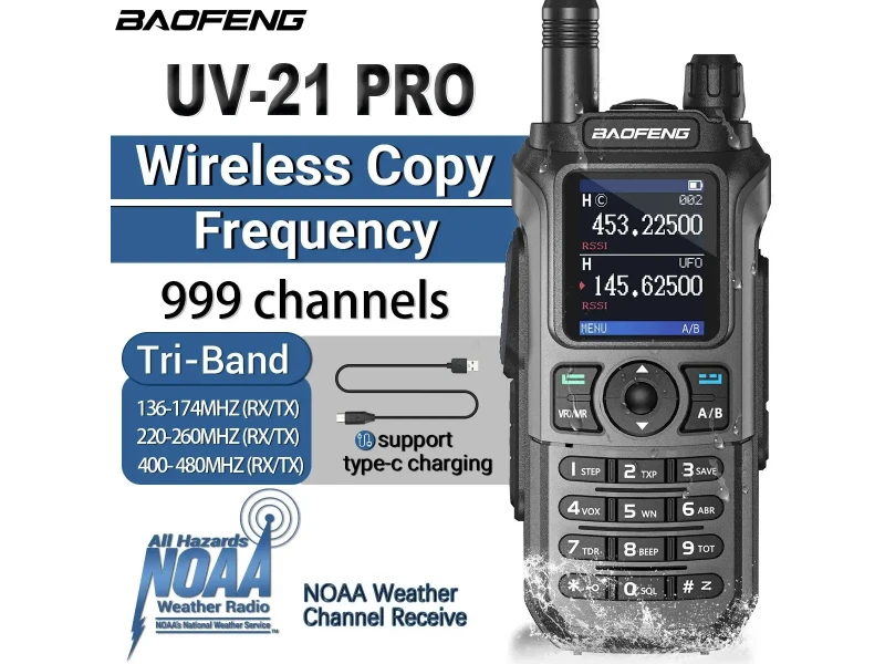 Спецификация:Тип: Двуканална радиостанция (Dual Band)Честотен обхват:VHF: 136-174 MHzUHF: 400-520 MHzМощност на предаване: 8W (висока мощност)Максимален обхват: При оптимални условия може да достигне до 10-15 кмТип батерия: Li-ion батерия с капацитет 2800mAhВреме на работа: До 12-16 часа в зависимост от интензивността на използване, до 48 часа в режим на изчакванеПорт за зареждане: USB Type-C за бързо зарежданеРазмери: 115 x 56 x 34 ммТегло: 260 г (с батерия)Дисплей: LCD дисплей с подсветка за лесна работа при слаба осветеностИздръжливост: Удароустойчив корпус, създаден за работа в тежки условияПотребителски интерфейс: Удобни бутони и копчета за бързо и лесно управлениеФункции и възможности:• Честота на тридесет ленти68-108MHZ (FM)136-174MHZ (RX/TX)220-260MHZ (RX/TX)400-480MHZ (RX/TX)• Type-C USB зареждане: Зареждането тип-C е тенденция за мобилни устройства, тъй като има ниски изисквания за източници на захранване и места. UV-21 Pro е Type-C USB презареждаема, за което можете лесно да я зареждате като телефон в колата си, със захранваща батерия или лаптоп. • Натиснете бутона за меню, за да влезете в интерфейса “FQSCAN”. Натиснете отново Меню и UV-21 Pro ще търси друга честота на радиопредаване и код за поверителност. Накрая натиснете менюто, за да запаметите честотата. • Нова тенденция черна технология 1,77-инчов дисплей с голям екран с висока разделителна способност. Има 2 различни режима на показване на честота и канал, които отговарят на вашите различни нужди. • Освен програмиране на радиото чрез компютърен софтуер, потребителите могат също да използват клавиатурата, за да програмират повечето настройки в менюто, например добавяне/изтриване на канал от паметта, добавяне/премахване на канал от списъка за сканиране, регулиране на VOX/шумоподтискане/пестене на енергия нива и др.• Двуканална работа (Dual Band): Възможност за работа на две различни честоти (VHF/UHF) едновременно, което увеличава ефективността при комуникация• Безжично копиране на честоти: Може да копира честотите от други радиостанции чрез безжичен трансфер, което прави настройките по-лесни и удобни• Поддръжка на CTCSS/DCS: Система за намаляване на шума и намаляване на интерференцията с други радиостанции• Сигнал за ниско ниво на батерията: Индикация на дисплея за изтощена батерия• Гласови функции: Възможност за комуникация с гласови съобщения• Поддръжка на DTMF: Поддръжка за кодове DTMF за дистанционно управление и контрол• Вградени функции за безопасност: Вграден SOS сигнал за спешни случаи• Възможности за свързване: Може да се свързва с външни антени за допълнителен обхватКомплектът включва:1 X Радиостанция1 X Антена1 X Li-ion батерия1 X Type-C USB зарядно1 X Основно зарядно устройство1 X Закопчалка за колан1 X Връзка за ръка1 X Ръководство за потребителя1 X Отвертка