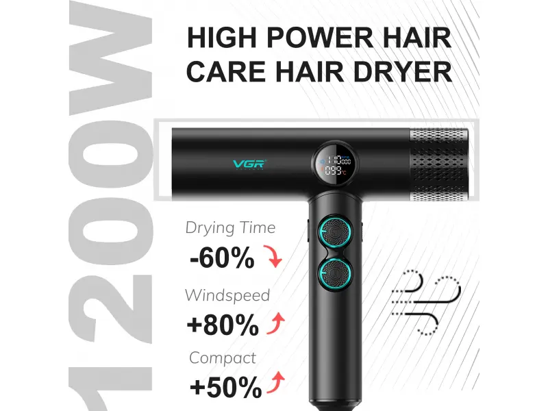• Професионален сешоар черен VGR-401 с отрицателни йони, BLDC мотор за бързо сушене с нисък шум, LED дисплей