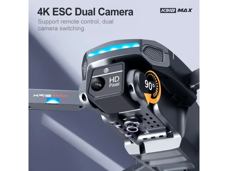 Този Сгъваем Дрон 4K K918 MAX предлага впечатляваща комбинация от функционалности и усъвършенствания.Спецификации:Модел: K918 MAXЦвят: СивМатериали: Пластмаса, метал, електронни компонентиЧестота: 2.4GКанал: 4CHЖироскоп: 6-осенМотор: БезчетковБатерия на Дрона: 7.4V 3000mAh Lipo (включена)Време за Зареждане: Около 120 минутиВреме за Полет: Около 25-35 минутиR/C Разстояние: Около 1500мБатерия на Дистанционното Управление: Вградена 3.7V 300mAh Lipo БатерияВреме за Използване на Дистанционното Управление: Около 10 часаКамера: 4K ESC HD + 1080P Основна КамераЗрителен ъгъл: 120° Широк ЪгълДиректна връзка в реално време : 5G WiFiFPV Разстояние: Около 1200мМаксимален Размер на Мобилния Телефон: 5.5 инчаРазмер на Дрона: 8.5x15x8cm (сгъваем), 30.5x26x8cm (несгъваем)Характеристики:Сгъваем Дизайн: Портативен и лесен за носене.4D Инфрачервено Избягване на Препятствия: Осигурява по-безопасен полет.4K ESC Камера: 50x увеличение, поддържа 90° дистанционно управление на ъгъла за по-широки снимки.3-осен Самостабилизиращ се механизъм: Поддържа стабилен баланс по време на полет, осигуряващ по-ясна въздушна фотография.GPS Позициониране: Осигурява по-точен полет.Летене с Фиксирана Точка чрез Оптичен Поток: Стабилен полет.5G WiFi FPV: Реално време предаване на изображението през камерата на телефона.Съраунд Действие: Дронът лети в кръг, предоставяйки уникални снимки.Режим на Полет на Точка: Просто нарисувайте маршрут на екрана и дронът ще го следва.7.4V 3000mAh Батерия: Полет до 25 минути. Технология за Защита срещу Смущения: По-стабилно предаване на данни.4 Канала: Възможности за изкачване, спускане, напред, назад, наляво, надясно.6-осен жироскоп: По-стабилен полет и лесно управление.3 Нива на Скорост на Полета: По-забавно летене.        Дронът разполага с обширен набор от функции, което го прави изключително гъвкав и удобен за ползване:Функции:Нагоре/Надолу: Регулиране на височината на полета.Напред/Назад: Преместване напред и назад във въздуха.Завой Наляво/Надясно: Завиване в ляво или вдясно по хоризонтала.Страничен Полет: Преместване в странична посока.3-степенна Скорост на Полета: Регулиране на скоростта за различни сцени и изживявания.LED Светлини: Предоставят визуални указания за полета, особено полезни при полети в тъмни условия.Комплекта включва:1бр. K918 MAX Дрон1бр. Дистанционно Управление1бр. 7.4V Lipo Батерия1бр. USB Кабел за Зареждане2бр. Резервни Остриета1бр. Отвертка1бр. Ръководство за Потребителя1бр. Чанта за Съхранение