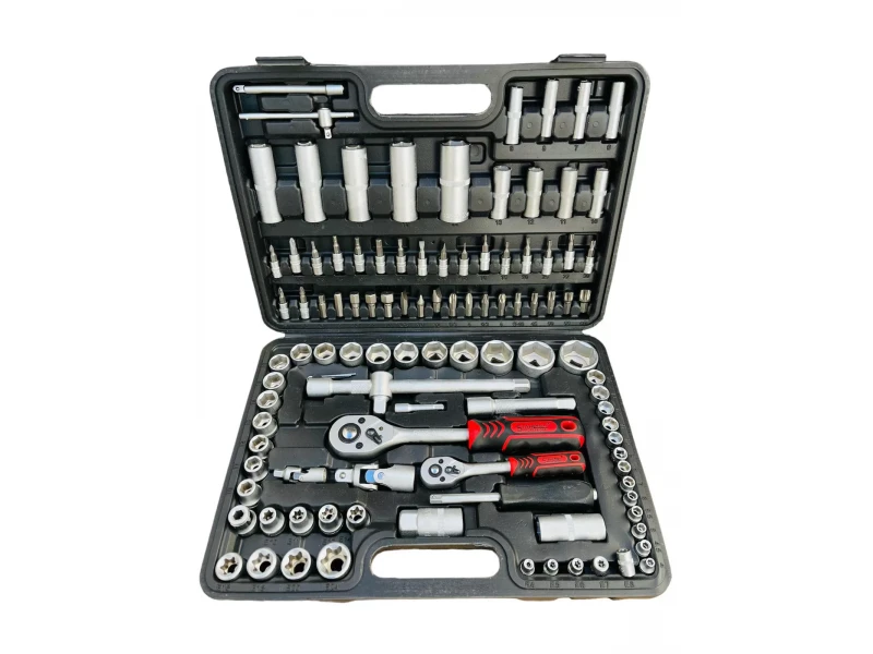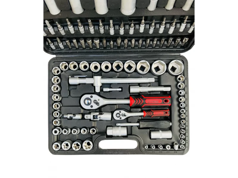 Комплекта включва :Тресчокта 1/2''тресчотка 1/4''върток 1/4'' 150ммвърток 1/4'' Т образен 100мм2 броя удължители 1/2'' : 125мм и 250мм2 броя удължители 1/4'' : 50мм и 75ммподвижна свръзка / кардан за гедоре 1/4''подвижна свръзка / кардан за гедоре 1/2'' Комбиниран адаптер 3/8'' - 1/2''вложка за накрайници 1/2''13 броя вложки 1/4'' къси: 4мм; 4.5мм; 5мм; 5.5мм; 6мм; 7мм; 8мм; 9мм; 10мм; 11мм; 12мм; 13мм; 14мм8 броя вложки 1/4'' дълги: 6мм; 7мм; 8мм; 9мм; 10мм; 11мм; 12мм; 13мм5 броя вложки е-торкс /е- torx(женски торкс) 1/4'' : E4; E5; E6; E7; E84 броя вложки кръстата отвертка 1/4'' : PH1; PH2; PZ1; PZ23 броя вложки плоска отвертка 1/4'' : 4мм; 5.5мм; 6.5мм7 броя вложки торкс / torx 1/4'' :Т8; Т10; Т15; Т20; Т25; Т27; Т304 вложки шестограм 1/4'': 3мм; 4мм; 5мм; 6мм17 броя вложки 1/2'' къси: 10мм; 11мм; 12мм; 13мм; 14мм; 15мм; 16мм; 17мм; 18мм; 19мм; 20мм; 21мм; 22мм; 24мм; 27мм; 30мм; 32мм5 броя вложки 1/2'' дълги: 14мм; 15мм; 17мм; 19мм; 22мм8 броя вложки е-торкс /е- torx(женски торкс) 1/2'': E10; E11; E12; E14; E16; Е18; Е20; Е24 2 броя вложки за свещи 1/2'' :16.0мм и 21.0мм4 броя накрайници кръстата отвертка: PH3; PH4; PZ3; PZ43 броя накрайници плоска отвертка: 8мм; 10мм; 12мм3 броя Г образни шестограми: 1.5мм; 2мм; 2,5мм5 броя накрайници шестограм: 7мм; 8мм; 10мм; 12мм; 14мм5 броя накрайници торкс / torx: Т40; Т45; Т50; Т55; T60