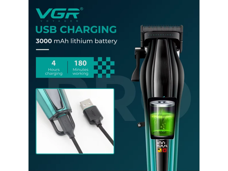 Купи професионална машинка за подстригване VGR V-273 с DLC остриета, 8000 об./мин, LED дисплей и батерия до 180 мин. Идеална за мъже, барбери и домашна грижа.